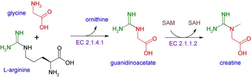 Creatine is not an essential nutrient.[21] It is an amino acid derivative, naturally produced in the human body from the amino acids glycine and arginine, with an additional requirement for S-adenosyl methionine (a derivative of methionine) to catalyze the transformation of guanidinoacetate to creatine. In the first step of the biosynthesis, the enzyme arginine:glycine amidinotransferase (AGAT, EC:2.1.4.1) mediates the reaction of glycine and arginine to form guanidinoacetate. This product is then methylated by guanidinoacetate N-methyltransferase (GAMT, EC:2.1.1.2), using S-adenosyl methionine as the methyl donor. Creatine itself can be phosphorylated by creatine kinase to form phosphocreatine, which is used as an energy buffer in skeletal muscles and the brain. A cyclic form of creatine, called creatinine, exists in equilibrium with its tautomer and with creatine.