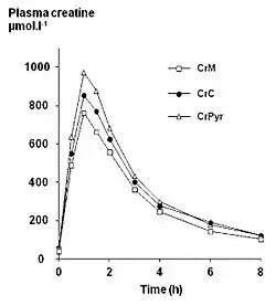 - ↑ Jäger R, Harris RC, Purpura M, Francaux M (November 2007). "Comparison of new forms of creatine in raising plasma creatine levels". Journal of the International Society of Sports Nutrition. 4: 17. doi:10.1186/1550-2783-4-17. PMC 2206055. PMID 17997838.