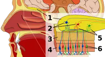 ![]() 1: Olfactory bulb 2: Mitral cells 3: Cribriform plate 4: Olfactory epithelium 5: Glomerulus 6: Olfactory receptor neurons | |