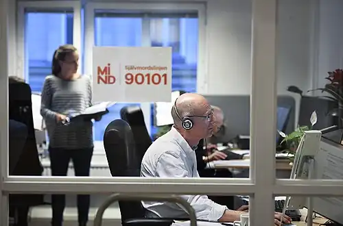A crisis hotline is a phone number people can call to get immediate emergency telephone counseling, usually by trained volunteers. The first such service was founded in England in 1951 and such hotlines have existed in most major cities of the English speaking world at least since the mid-1970s. Initially set up to help those contemplating suicide, many have expanded their mandate to deal more generally with emotional crises. Similar hotlines operate to help people in other circumstances, including rape, eating disorders, bullying, self-harm, runaway children, human trafficking, and people who identify as LGBTQ+ or intersex. Despite crisis hotlines being common, their effectiveness in reducing suicides is not clear.[1][2]