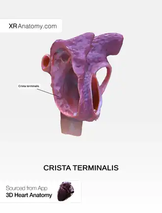 The crista terminalis generally takes the form of a smooth-surfaced, crescent-shaped thickened portion of heart muscle at the opening into the right atrial appendage. It consists of fibromuscular tissue.[3]