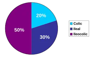 Abdominal pain is a common initial symptom of Crohn's disease,[2] especially in the lower right abdomen.[24] It is often accompanied by diarrhea, which may or may not be bloody. Inflammation in different areas of the intestinal tract can affect the quality of the feces. Ileitis typically results in large-volume, watery feces, while colitis may result in a smaller volume of feces of higher frequency. Fecal consistency may range from solid to watery. In severe cases, an individual may have more than 20 bowel movements per day, and may need to awaken at night to defecate.[1][25][26][27] Visible bleeding in the feces is less common in Crohn's disease than in ulcerative colitis, but is not unusual.[1] Bloody bowel movements are usually intermittent, and may be bright or dark red in color. In severe Crohn's colitis, bleeding may be copious.[25] Flatulence and bloating may add to the intestinal discomfort.[25][28][29]