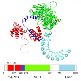 NOD2 protein model with schematic diagram. Two N-terminal CARD domains (red) connected via helical linker (blue) with central NBD domain (green). At C-terminus LRR domain (cyan) is located. Additionally, some mutations which are associated with certain disease patterns in Crohn's disease are marked in red wire representation.[71]