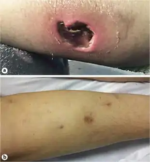 Crohn's disease may also involve the skin, blood, and endocrine system. Erythema nodosum is the most common type of skin problem, occurring in around 8% of people with Crohn's disease, producing raised, tender red nodules usually appearing on the shins.[37][39][40] Erythema nodosum is due to inflammation of the underlying subcutaneous tissue, and is characterized by septal panniculitis.[39] Pyoderma gangrenosum is a less common skin problem, occurring in under 2%,[40] and is typically a painful ulcerating nodule.[39][36]