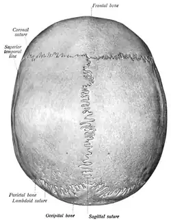 Below the crown, the frontal bone and the parietal bones are separated by a range of fibrous joints called sutures. The sutures are an essential part of growth and development, allowing the skull to expand as the brain increases in size. Different sutures between the frontal and parietal bones of the skull expand in specific directions, causing a symmetrically shaped human head.[3] The frontal bone and the parietal bones are joined at the frontal suture. The frontal bone has a number of parts, including the squamous part, the orbital part, and the nasal parts. The frontal bone connects to the parietal bone at the coronal suture to shape the crown and sides of the skull. The two separate parietal bones are joined at the sagittal suture, ensuring the crown is stable.[4] Other structures of the human crown include blood vessels and nerves, which are essential for the allocation of nutrients to the brain, and the transmission of information to the brain. The superficial temporal artery branches from the common external carotid artery and delivers oxygenated blood to the crown.[5] The crown also contains branches of the trigeminal nerve.[2]