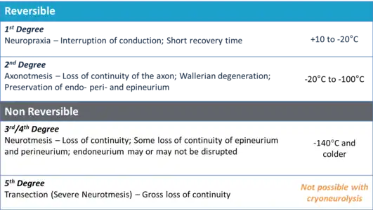 Classification of nerve damage was well-defined by Sir Herbert Seddon and Sunderland in a system that remains in use.[7] The adjacent table details the forms (neurapraxia, axonotmesis and neurotmesis) and degrees of nerve injury that occur as a result of exposure to various temperatures, with the intent to interrupt nerve traffic and relieve pain.