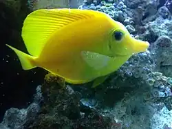 | Yellow tang with white spots characteristic of marine ich | |