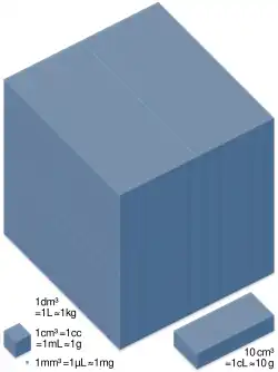 A cubic centimetre (or cubic centimeter in US English) (SI unit symbol: cm3; non-SI abbreviations: cc and ccm) is a commonly used unit of volume that corresponds to the volume of a cube that measures 1 cm × 1 cm × 1 cm. One cubic centimetre corresponds to a volume of one millilitre. The mass of one cubic centimetre of water at 3.98 °C (the temperature at which it attains its maximum density) is almost equal to one gram.