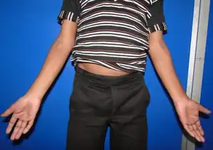 When present at birth, it can be an indication of Turner syndrome[1] or Noonan syndrome. It can also be acquired through fracture or other trauma. The physiological cubitus valgus varies from 3° to 29°. Women usually have a more pronounced Cubitus valgus than men. The deformity can also occur as a complication of fracture of the lateral condyle of the humerus, which may lead to tardy/delayed ulnar nerve palsy.The opposite condition is cubitus varus (736.02).