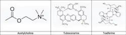 Tubocurarine and C toxiferine consist of a cyclic system with quaternary ammonium ions. On the other hand, while acetylcholine does not contain a cyclic system, it does contain a quaternary ammonium ion. Because of this shared moiety, curare alkaloids can bind readily to the active site of receptors for acetylcholine (ACh) at the neuromuscular junction, blocking nerve impulses from being sent to the skeletal muscles, effectively paralyzing the muscles of the body.