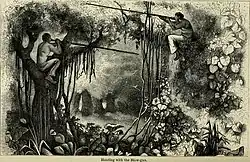 Curare was used as a paralyzing poison by many South American indigenous people. Since it was too expensive to be used in warfare, curare was mainly used for hunting.[3] The prey was shot by arrows or blowgun darts dipped in curare, leading to asphyxiation owing to the inability of the victim's respiratory muscles to contract. In particular, the poison was used by the Kalinago, indigenous people of the Lesser Antilles in the Caribbean, on the tips of their arrows.[4] In addition, the Yagua people, indigenous to Colombia and northeastern Peru, commonly used these toxins via blowpipes to target prey 30 to 40 paces distant.[5]