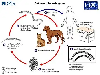 Cutaneous larva migrans (abbreviated CLM) is a skin disease in humans, caused by the larvae of various nematode parasites of the hookworm family (Ancylostomatidae).[5] These parasites live in the intestines of dogs, cats, and wild animals and should not be confused with other members of the hookworm family for which humans are definitive hosts, namely Ancylostoma duodenale and Necator americanus.[4]