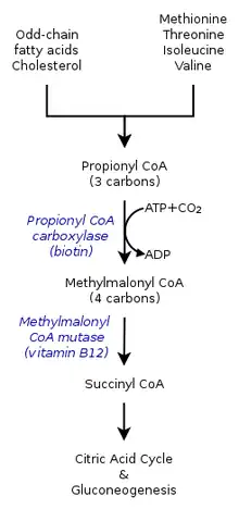 (as adenosylcobalamin) to make succinyl-CoA. When the conversion of propionyl-CoA to succinyl-CoA in the mitochondria fails due to Vitamin B