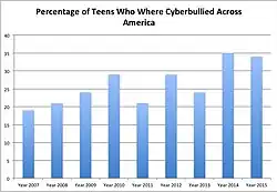 Cyberbullying (cyberharassment or online bullying) is a form of bullying or harassment using electronic means. Since the 2000s, it has become increasingly common, especially among teenagers and adolescents, due to young people's increased use of social media.[1] Related issues include online harassment and trolling. In 2015, according to cyberbullying statistics from the i-Safe Foundation, over half of adolescents and teens had been bullied online, and about the same number had engaged in cyberbullying.[2] Both the bully and the victim are negatively affected, and the intensity, duration, and frequency of bullying are three aspects that increase the negative effects on both of them.[3]