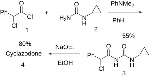 α-Chlorophenylacetyl chloride (1) and 1-cyclopropylurea (2) react to give the amide (3). The heterocycle cyclazodone is formed on threatment of this with sodium ethoxide.[2][6]