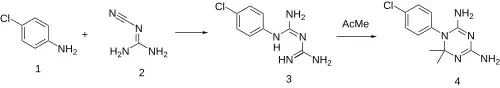 The reaction between 4-chloroaniline [106-47-8] (1) and dicyandiamide (aka 2-cyanoguanidine) [461-58-5 ] (2) gives 4-chlorophenylbiguanide [5304-59-6] (3). The condensation of this immediately with acetone to form the aminal cycloguanil (4).