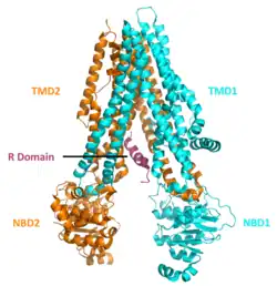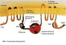 The CFTR gene is approximately 189 kb in length, with 27 exons and 26 introns.[49] CFTR is a glycoprotein and is found on the surface of many epithelial cells in the body.[50] CFTR consists of five domains, which include two transmembrane or membrane-spanning domains, two nucleotide-binding domains and a regulatory domain.[51] The transmembrane domains are each connected to a nucleotide binding domain (NBD) in the cytoplasm. The first NBD is connected to the second transmembrane domain by a regulatory "R" domain that is a unique feature of CFTR, not present in other ABC transporters which carries 19 predicted sites for protein kinase A(PKA). Six of these have been reported to be phosphorylated in vivo.[52] The ion channel only opens when its R-domain has been phosphorylated by PKA and ATP is bound at the NBDs. Phosphorylation displaces the disordered R domain from positions preventing NBD dimerization and opening.[53][54] The amino-terminus is part of the lasso motif which anchors into the cell membrane.[52] The carboxyl terminal of the protein is anchored to the cytoskeleton by a PDZ-interacting domain.[55]