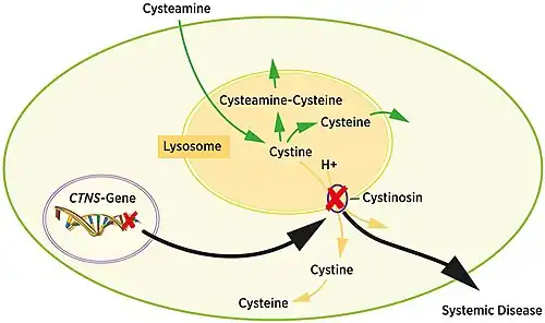 Cystinosis was the first documented genetic disease belonging to the group of lysosomal storage disease disorders.[3] Cystinosis is caused by mutations in the CTNS gene that codes for cystinosin, the lysosomal membrane-specific transporter for cystine. Intracellular metabolism of cystine, as it happens with all amino acids, requires its transport across the cell membrane. After degradation of endocytosed protein to cystine within lysosomes, it is normally transported to the cytosol. But if there is a defect in the carrier protein, cystine is accumulated in lysosomes. As cystine is highly insoluble, when its concentration in tissue lysosomes increases, its solubility is immediately exceeded and crystalline precipitates are formed in almost all organs and tissues.[4]