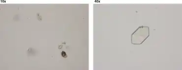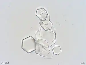 | These cystine crystals were found in the urine sediment of a male dog who presented to the veterinary hospital with a history of chronic stranguria (straining to urinate) and pollakiuria (abnormally increased frequency of urination). A cystotomy was performed and numerous cystoliths (bladder stones) were removed. 5μm scale bar; 1,000x magnification; focus-stacked image consisting of 12 exposures; courtesy of Lance Wheeler. | |