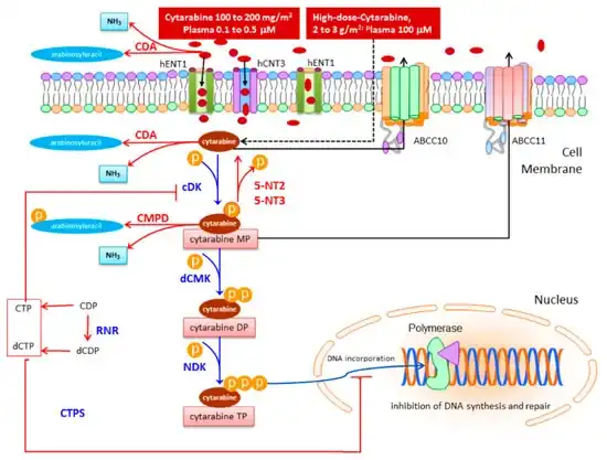 - ↑ Di Francia, Raffaele; Crisci, Stefania; De Monaco, Angela; Cafiero, Concetta; Re, Agnese; Iaccarino, Giancarla; De Filippi, Rosaria; Frigeri, Ferdinando; Corazzelli, Gaetano; Micera, Alessandra; Pinto, Antonio (January 2021). "Response and Toxicity to Cytarabine Therapy in Leukemia and Lymphoma: From Dose Puzzle to Pharmacogenomic Biomarkers". Cancers. 13 (5): 966. doi:10.3390/cancers13050966. ISSN 2072-6694.