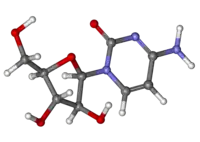 Cytarabine, also known as cytosine arabinoside (ara-C), is a chemotherapy medication used to treat acute myeloid leukemia (AML), acute lymphocytic leukemia (ALL), chronic myelogenous leukemia (CML), and non-Hodgkin's lymphoma.[1] It is given by injection into a vein, under the skin, or into the cerebrospinal fluid.[1] There is a liposomal formulation for which there is tentative evidence of better outcomes in lymphoma involving the meninges.[1]