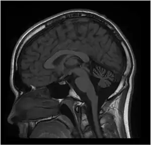 MRI of the brain. MRI was performed on Person 1 at 12 years of age. T1W1 sagittal image demonstrates prominent cerebellar atrophy involving superior and middle cerebellar folia. Axial images (not shown) revealed normal subcortical and cerebellar white matter. MR spectroscopy was normal (not shown). Repeat MRI imaging at 16 years old was unchanged (not shown). MRI of the brain (Person 2) showed a similar pattern but milder cerebellar atrophy (not shown).