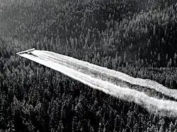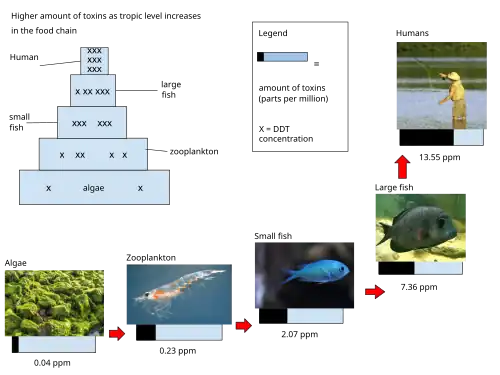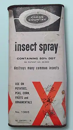By October 1945, DDT was available for public sale in the United States. Although it was promoted by government and industry for use as an agricultural and household pesticide, there were also concerns about its use from the beginning.[9] Opposition to DDT was focused by the 1962 publication of Rachel Carson's book Silent Spring. It talked about environmental impacts that correlated with the widespread use of DDT in agriculture in the United States, and it questioned the logic of broadcasting potentially dangerous chemicals into the environment with little prior investigation of their environmental and health effects. The book cited claims that DDT and other pesticides caused cancer and that their agricultural use was a threat to wildlife, particularly birds. Although Carson never directly called for an outright ban on the use of DDT, its publication was a seminal event for the environmental movement and resulted in a large public outcry that eventually led, in 1972, to a ban on DDT's agricultural use in the United States.[10] Along with the passage of the Endangered Species Act, the United States ban on DDT is a major factor in the comeback of the bald eagle (the national bird of the United States) and the peregrine falcon from near-extinction in the contiguous United States.[11][12]