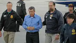 DEA agents escort Colombian drug lord Miguel Rodríguez Orejuela after his extradition to the United States in 2005.