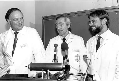 Scientists R. Michael Blaese, W. French Anderson, and Kenneth Culver at the press conference that announced the start of the first ever gene therapy trial for severe combined immunodeficiency (SCID) in 1990.