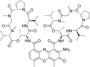 Dactinomycin, also known as actinomycin D, is a chemotherapy medication used to treat a number of types of cancer.[2] This includes Wilms tumor, rhabdomyosarcoma, Ewing's sarcoma, trophoblastic neoplasm, testicular cancer, and certain types of ovarian cancer.[2] It is given by injection into a vein.[2]