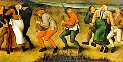 Affecting thousands of people across several centuries, dancing mania was not an isolated event, and was well documented in contemporary reports. It was nevertheless poorly understood, and remedies were based on guesswork. Often musicians accompanied dancers, due to a belief that music would treat the mania, but this tactic sometimes backfired by encouraging more to join in. There is no consensus among modern-day scholars as to the cause of dancing mania.[1] The several theories proposed range from religious cults being behind the processions to people dancing to relieve themselves of stress and put the poverty of the period out of their minds. It is speculated to have been a mass psychogenic illness, in which physical symptoms with no known physical cause are observed to affect a group of people, as a form of social influence.[1]