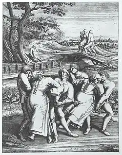 Prayers were also made to St. John the Baptist, who some believed also caused the dancing.[6]: 32 Others claimed to be possessed by demons,[2]: 136 or Satan,[10] therefore exorcisms were often performed on dancers.[11]: 60 Bartholomew notes that music was often played while participants danced, as that was believed to be an effective remedy,[2]: 136 and during some outbreaks musicians were even employed to play.[2]: 139 Midelfort describes how the music encouraged others to join in, however, and thus effectively made things worse, as did the dancing places that were sometimes set up.[6]: 35