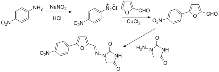 The original patent synthesis started with para-nitroaniline which undergoes diazotization followed by a copper(II) chloride catalyzed arylation with furfural (essentially a modified Meerwein arylation). This then reacts with 1-aminohydantoin to form the final product.