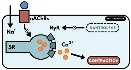 - ↑ 5.0 5.1 5.2 5.3 5.4 5.5 5.6 5.7 Krause T, Gerbershagen MU, Fiege M, Weisshorn R, Wappler F (2004). "Dantrolene – a review of its pharmacology, therapeutic use and new developments". Anaesthesia. 59 (4): 364–73. doi:10.1111/j.1365-2044.2004.03658.x. PMID 15023108. S2CID 18537509.