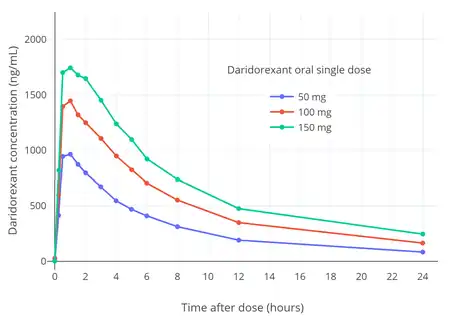 The medication has an elimination half-life of about 8 hours[2] or of 6 to 10 hours.[3] Its half-life is shorter than that of other orexin receptor antagonists such as suvorexant (12 hours) and lemborexant (~18–55 hours).[3] The relatively short half-life of daridorexant may allow for reduced daytime sedation.[3][15] The duration of action of daridorexant in terms of sedative effects is approximately 8 hours with a 50 mg dose.[3]
