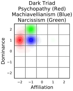 The Atlas of Personality, Emotion and Behaviour[163] is a catalogue of 2,400 words descriptive of personality, emotion and behaviour. The words in the catalogue were scored according to a two dimensional matrix taxonomy with orthogonal dimensions of affiliation and dominance. Adjectives representing the behavioural patterns described by the Dark Triad were scored according to the atlas and visualised using kernel density plots in two dimensions. The atlas clearly delineates the three components of the Dark Triad, narcissism (Yellow), Machiavellianism (blue), and psychopathy (red).