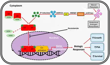 - ↑ 23.0 23.1 23.2 Fizazi K, Smith MR, Tombal B (October 2018). "Clinical Development of Darolutamide: A Novel Androgen Receptor Antagonist for the Treatment of Prostate Cancer". Clinical Genitourinary Cancer. 16 (5): 332–340. doi:10.1016/j.clgc.2018.07.017. PMID 30197098.