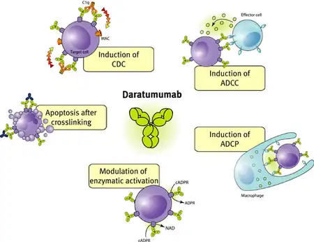 - ↑ Franssen LE, Stege CA, Zweegman S (2020). "Resistance Mechanisms Towards CD38-Directed Antibody Therapy in Multiple Myeloma". Journal of Clinical Medicine. 9 (4): 1195. doi:10.3390/jcm9041195. PMC 7230744. PMID 32331242.