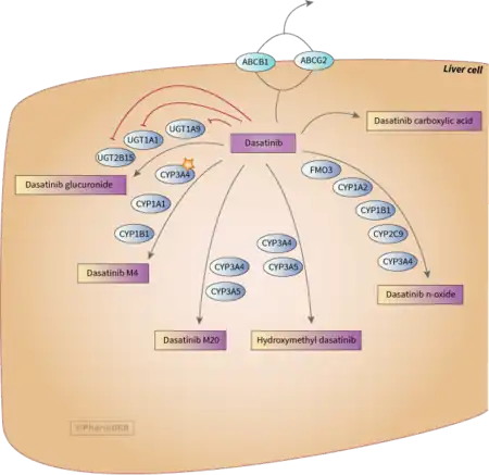- ↑ 10.0 10.1 Levêque D, Becker G, Bilger K, Natarajan-Amé S (2020). "Clinical Pharmacokinetics and Pharmacodynamics of Dasatinib". Clinical Pharmacokinetics. doi:10.1007/s40262-020-00872-4. PMID 32112275.