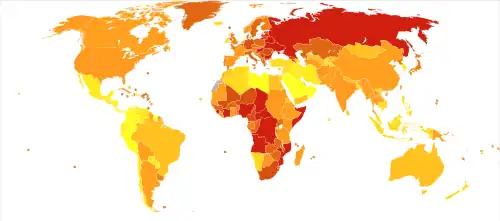 In developing nations, inferior sanitary conditions and lack of access to modern medical technology make death from infectious diseases more common than in developed countries. One such disease is tuberculosis, a bacterial disease that killed 1.8 million people in 2015.[49] In 2004, malaria caused about 2.7 million deaths annually.[50] The AIDS death toll in Africa may reach 90–100 million by 2025.[51][52]