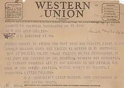 The United States Armed Forces set up casualty-notification teams shortly after the Battle of Ia Drang (1965) at the beginning of the American full-scale military involvement in the Vietnam War. Before, the notification telegrams were handed over to taxi cab drivers for delivery to the next of kin. Julia Compton Moore, the wife of a commanding US officer during the battle of Ia Drang, followed in the wake of the deliveries to widows in the Fort Benning housing complex. She grieved with the wives, comforted the children and attended the funerals of all the men killed under her husband's command who were buried at Fort Benning.[3] Her complaints about the notifications prompted the U.S. Army to quickly set up two-man teams to deliver them, consisting of an officer and a chaplain.[4] Mrs. Frank Henry, the wife of the battalion executive officer and Mrs. James Scott, wife of the battalion command sergeant major, performed the same duty for the dead of the 2nd Battalion, 7th Cavalry.[5]