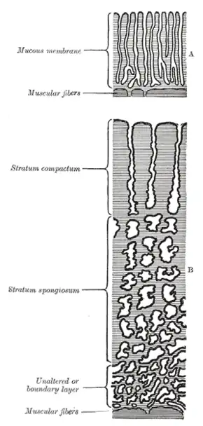 ![]() Diagrammatic sections of the uterine mucous membrane: A. The non-pregnant uterus. B. Decidua parietalis; the mucous membrane in the pregnant uterus and not beneath the placenta. | |