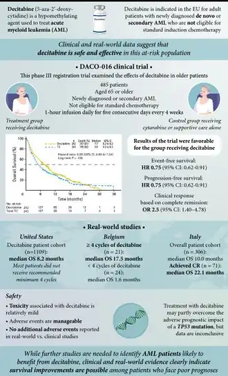 - ↑ Santini, Valeria; Lübbert, Michael; Wierzbowska, Agnieszka; Ossenkoppele, Gert J. (April 2022). "The Clinical Value of Decitabine Monotherapy in Patients with Acute Myeloid Leukemia". Advances in Therapy. 39 (4): 1474–1488. doi:10.1007/s12325-021-01948-8. ISSN 1865-8652. Retrieved 5 December 2023.