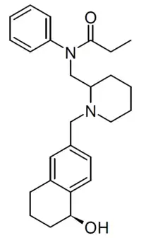 - ↑ Deekonda S, Rankin D, Davis P, Lai J, Vanderah TW, Porecca F, et al. (January 2016). "Design synthesis and structure-activity relationship of 5-substituted (tetrahydronaphthalen-2yl)methyl with N-phenyl-N-(piperidin-2-yl)propionamide derivatives as opioid ligands". Bioorganic & Medicinal Chemistry. 24 (2): 85–91. doi:10.1016/j.bmc.2015.11.030. PMC 4873254. PMID 26712115.