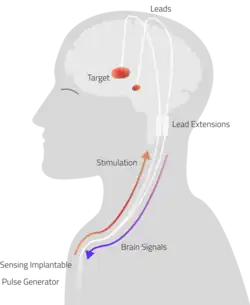 Deep brain stimulation (DBS) is a type of neurostimulation therapy in which an implantable pulse generator is surgically implanted below the skin of the chest and connected by leads to the brain to deliver controlled electrical impulses. These charges therapeutically disrupt and promote dysfunctional nervous system circuits bidirectionally in both ante- and retrograde directions.[1] Though first developed for Parkinsonian tremor, the technology has since been adapted to a wide variety of chronic neurologic disorders.[2]