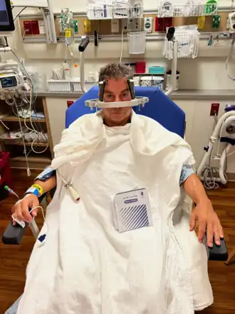 An adult male undergoing pre-operative preparation for deep brain stimulation
