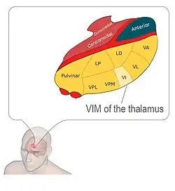 DBS is used to manage Parkinson's disease symptoms that are resistant to medication.[20][30] The ideal candidate for DBS is one that does not have dementia, is not severely depressed, and who does not have falls while being in their best on-drug state, but who do have disabling motor fluctuations or dyskinesias that necessitate bilateral surgery.[1] It is treated by applying high-frequency (> 100 Hz) stimulation to target structures in the deep subcortical white matter of the basal ganglia. Frequently used targets include the subthalamic nucleus (STN), globus pallidus internus (GPi) and ventrointermediate nucleus of the thalamus (VIM). Neurostimulation can be considered for people who have Parkinson's with motor fluctuations and tremors inadequately controlled by medication, or to those who are intolerant to medication as long as they do not have severe neuropsychiatric problems.[31] A >30% degree of symptom responsiveness to dopamine is a strong predictor of a good response to DBS surgery, though it is not mandatory. This has led most centers to require evaluation both on and off dopamine prior to the procedure to increase the likelihood of success.[32] DBS is not currently considered to be a disease-modifying treatment.[33] Shorter disease duration pre-operatively tends to lead to better results after surgery. The response from DBS is only as good as the patient's best "on" time, with the exception of tremor, which may show greater improvement than that seen with medication.[34]