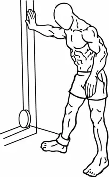 Most practitioners agree that spasm, strain, or pain in any muscle can often be treated by regular stretching exercise of that muscle, no matter the cause of the pain. Stretching is recommended every two to three waking hours. Anterior and posterior movement of the hip joint capsule may help optimize the patient's stretching capacity.[18] The muscle can be manually stretched by applying pressure perpendicular to the long axis of the muscle and parallel to the surface of the buttocks until the muscle is relaxed.[19] Another stretching exercise is to lie on the side opposite of the pain with the hip and knee of the upper leg flexed and adducted towards the ground while the torso is rotated so that the back of the upper shoulder touches the ground.[20] Physical Therapists may suggest stretching exercises that will target the piriformis, but may also include the hamstrings and hip muscles in order to adequately reduce pain and increase range of motion. Patients with piriformis syndrome may also find relief from applications of ice which will help reduce inflammation and so may help limit pressure on the sciatic nerve. This treatment can be helpful when pain starts or immediately after an activity that is likely to cause pain. As the length of time progresses, heat may provide temporary relief from many types of muscle pain and will temporarily increase muscle flexibility.
