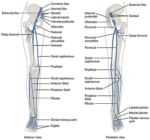 DVT in the legs is proximal when above the knee and distal (or calf) when below the knee.[66][67] DVT below the popliteal vein, a proximal vein behind the knee, is classified as distal[58] and has limited clinical significance compared to proximal DVT.[68] Iliofemoral DVT has been described as involving either the iliac or common femoral vein;[69] elsewhere, it has been defined as involving at a minimum the common iliac vein, which is near the top of the pelvis.[18] Upper extremity DVT occurs in the arms or the base of the neck. A rare and massive DVT that causes significant obstruction is phlegmasia cerulea dolens, so named because of observed cases with a blue or purplish discoloration.[70][71][lower-alpha 6] It is a particularly severe form of acute, proximal, and occlusive DVT. It is life-threatening, limb-threatening, and carries a risk of venous gangrene.[72] It can occur in the arm but more commonly affects the leg.[59][73]