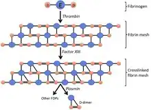 The causes of arterial thrombosis, such as with heart attacks, are more clearly understood than those of venous thrombosis.[77] With arterial thrombosis, blood vessel wall damage is required, as it initiates coagulation,[77] but clotting in the veins mostly occurs without any such damage.[25] The beginning of venous thrombosis is thought to be caused by tissue factor, which leads to conversion of prothrombin to thrombin, followed by fibrin deposition.[34] Red blood cells and fibrin are the main components of venous thrombi,[25] and the fibrin appears to attach to the blood vessel wall lining (endothelium), a surface that normally acts to prevent clotting.[77] Platelets and white blood cells are also components. Platelets are not as prominent in venous clots as they are in arterial ones, but they can play a role.[21] Inflammation is associated with VTE,[lower-alpha 7] and white blood cells play a role in the formation and resolution of venous clots.[75]
